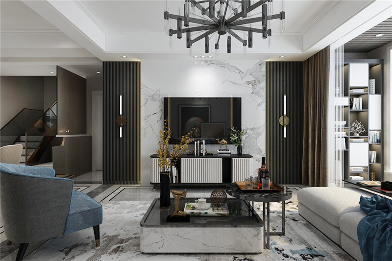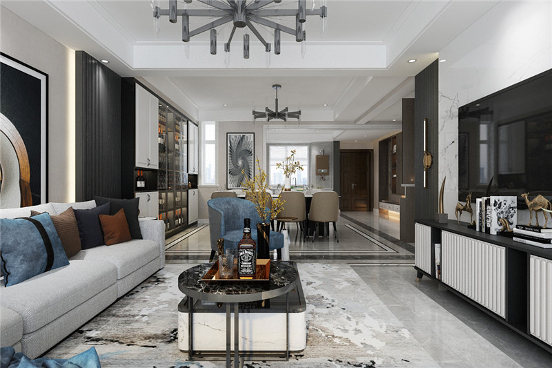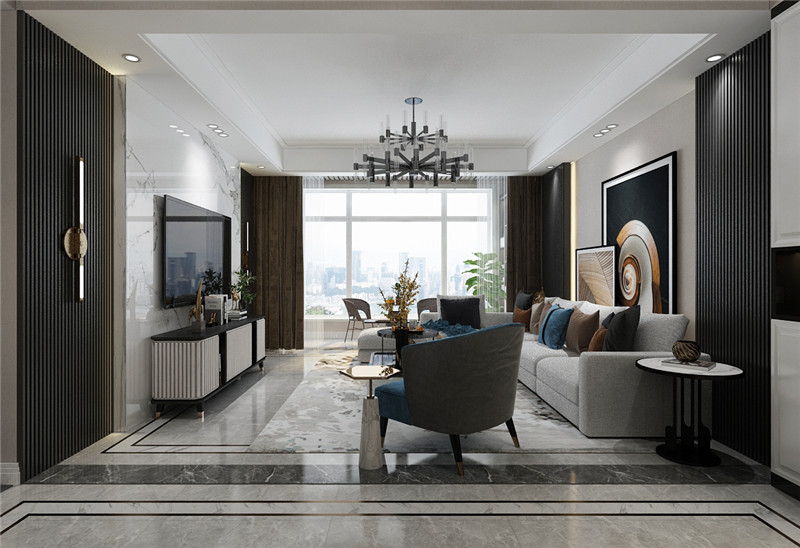 设计理念:现代轻奢风格是最近比较流行的风格,注重空间与设计的结合 ,符合业主的装修要求。整体实用而具造型美,营造出柔情理性的审美情趣。体贴而富有性格的客厅,诉说着一种强烈的视觉语言,是设计师对空间的独特诠释,艺术性的造型及对比的色彩效果,营造出一个视觉丰富的空间世界。餐厅与客厅结合在一起,调节了气氛,使整个空间显得亲和、温馨而舒适。尽可能不用多余的东西,服务多于功能,给主人一个放松的空间,以宁缺毋滥的精髓,合理化简化居室。主卧房以温馨宁静取胜,壁面以原木造型装饰,床头流畅的线条表现出活泼欢快的感觉,并与壁灯灯光相互辉映,塑造出罗曼蒂克气氛。