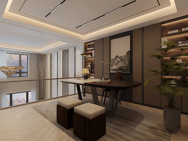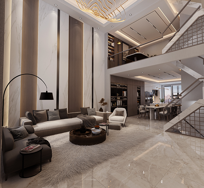 设计理念:此方案设计是运用无主灯设计,利用烟熏木皮色搭配石材创造出整体时尚感觉,挑空区域简洁大方,几种材质碰撞,达到此效果。