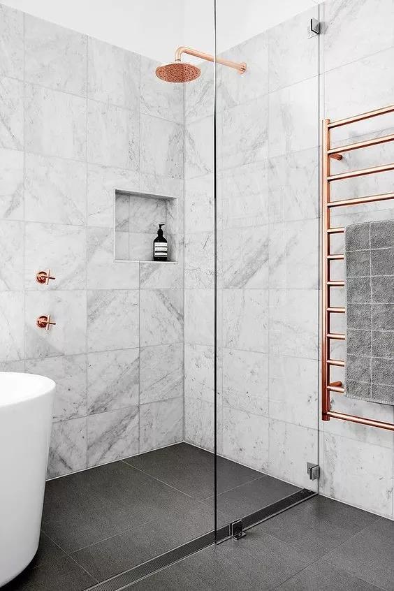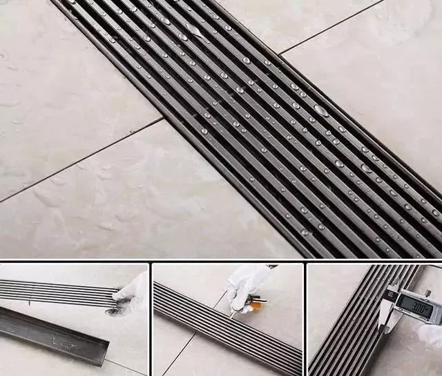 采用单层淋浴屏设计,一定要配合一个神器,那就是这种拥有大面积排水口的长方形地漏,他的排水量和排水速度可以达到普通排水口的十倍。