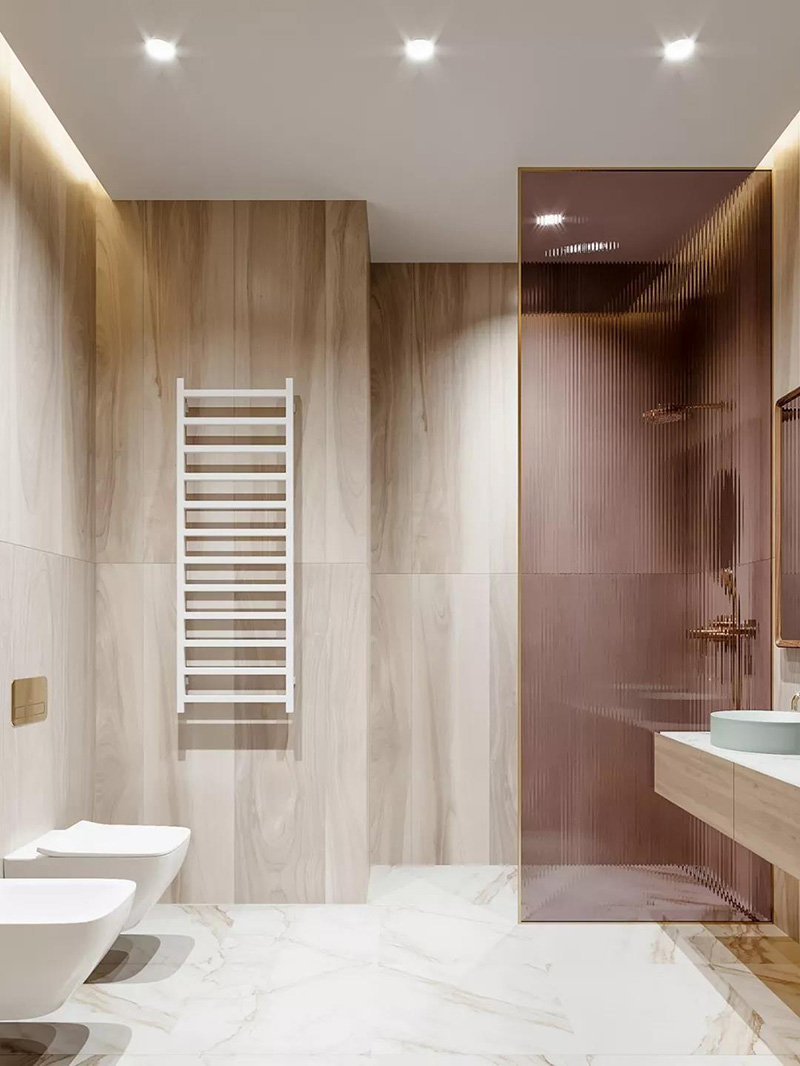 如果担心透明玻璃没有私密性,可以增加一个防水浴帘,也可以选用压花玻璃、长虹玻璃等非透明玻璃,特殊的玻璃花纹可以折射出不同的光影效果,营造出一种朦胧美。