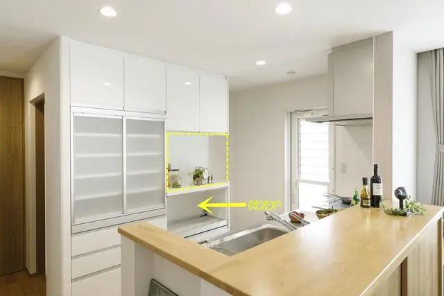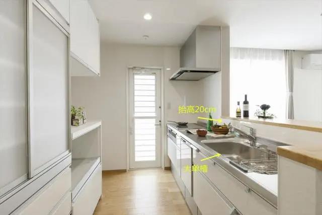日本的橱柜一般都是面向客厅的,为了避免尴尬,大多数业主会将台面抬高20公分,主要是起到遮挡的作用,而且还能多出好几平收纳空间呢!
