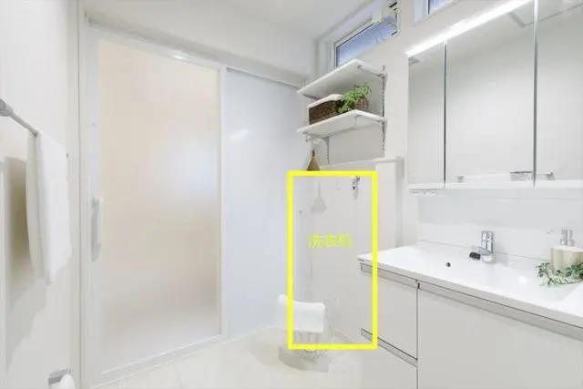 日本的洗漱区空间通常都比较大,洗衣机放在这儿动线比较短,洗澡前将脏衣服脱了扔进洗衣机就好。另外洗衣机的上方空间别浪费,加上隔板和伸缩杆,又是一处好的收纳空间。